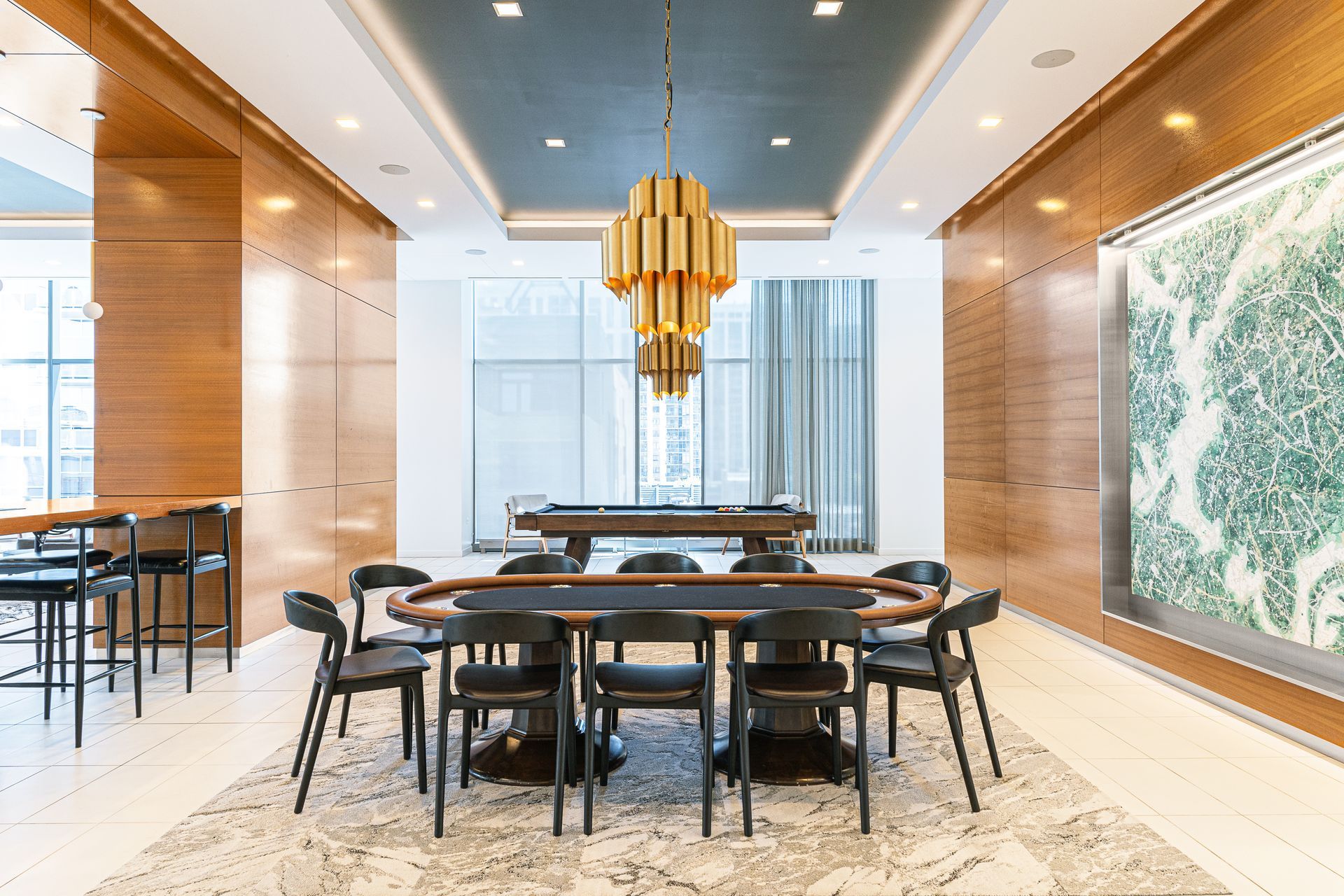 This luxury high-rise amenity space blends modern design with plenty of opportunities to play and connect. From statement lighting to warm wood details, every element was carefully chosen to create a space where residents can gather, unwind, and make memories. Whether you’re breaking out your best poker face or calling next on the pool table, this is the spot where community comes to life.